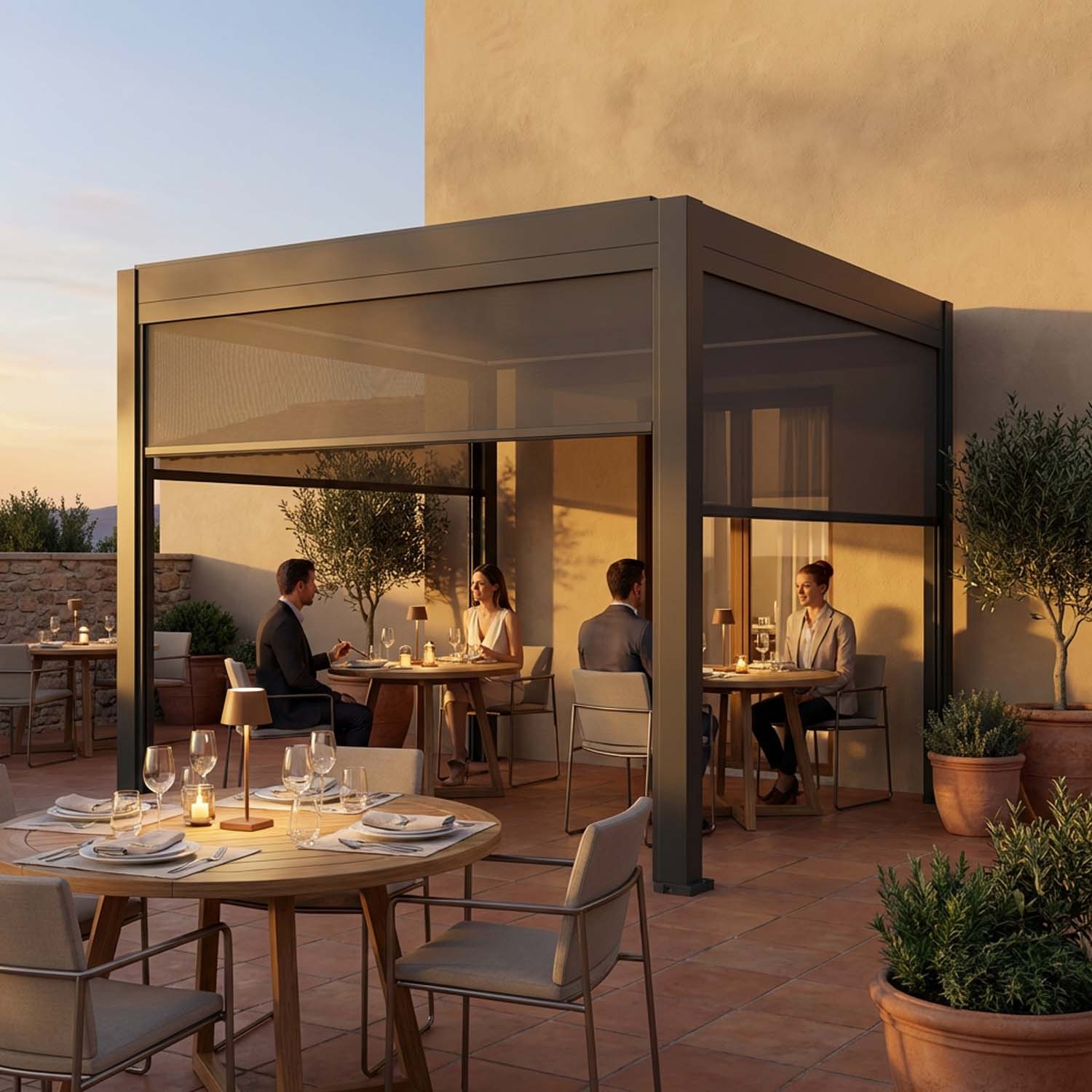 Transforms your dining or relaxation area into a sheltered space during cooler months or in the evening. No insects, controlled temperature, all year round.