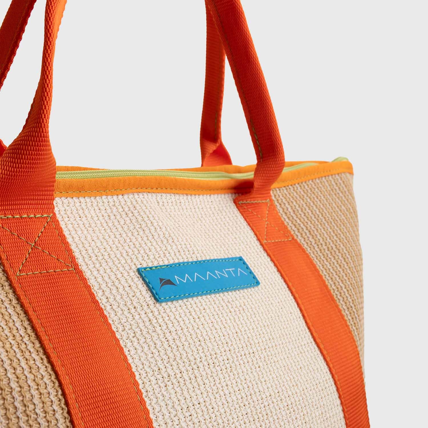 Two-tone beach bag with orange inserts and green and blue details, comfortable fabric handles, top zip closure.