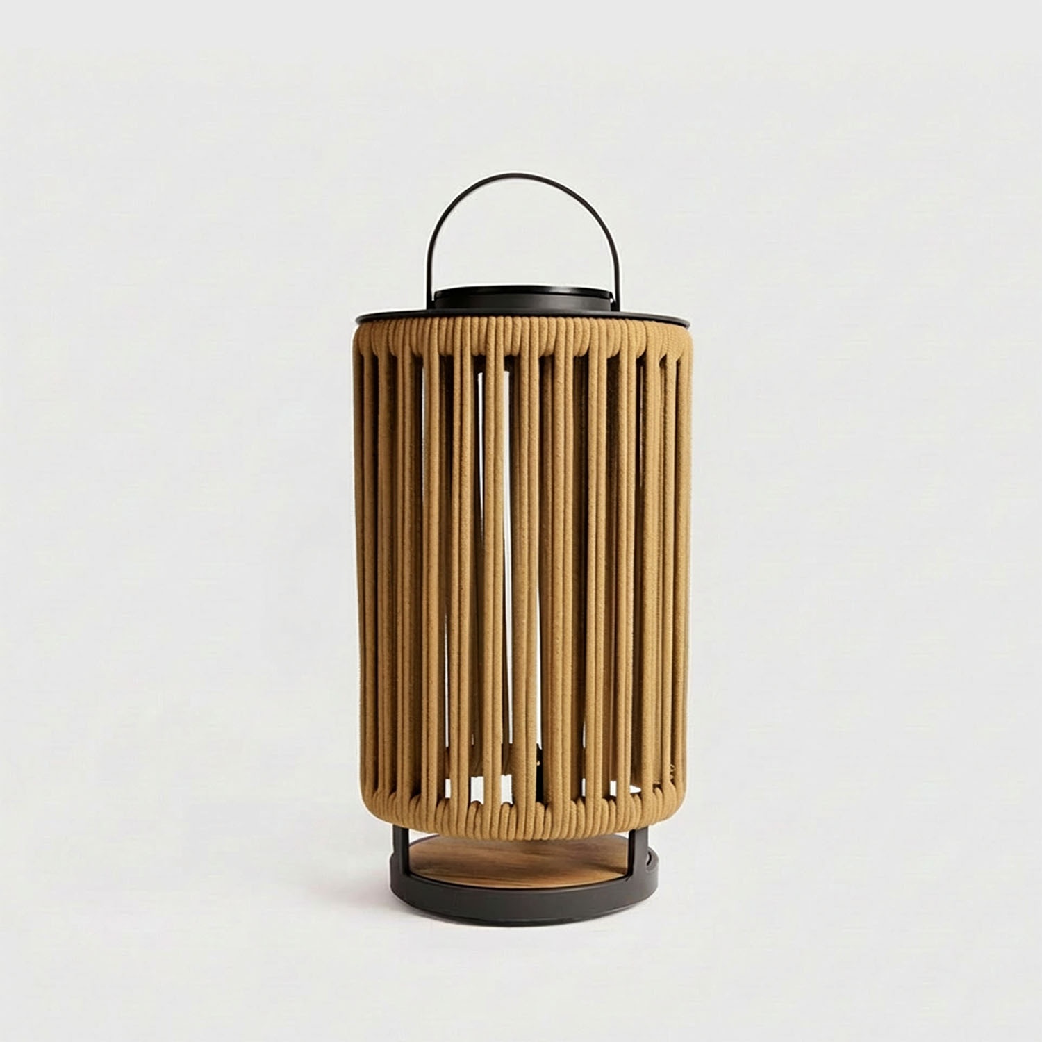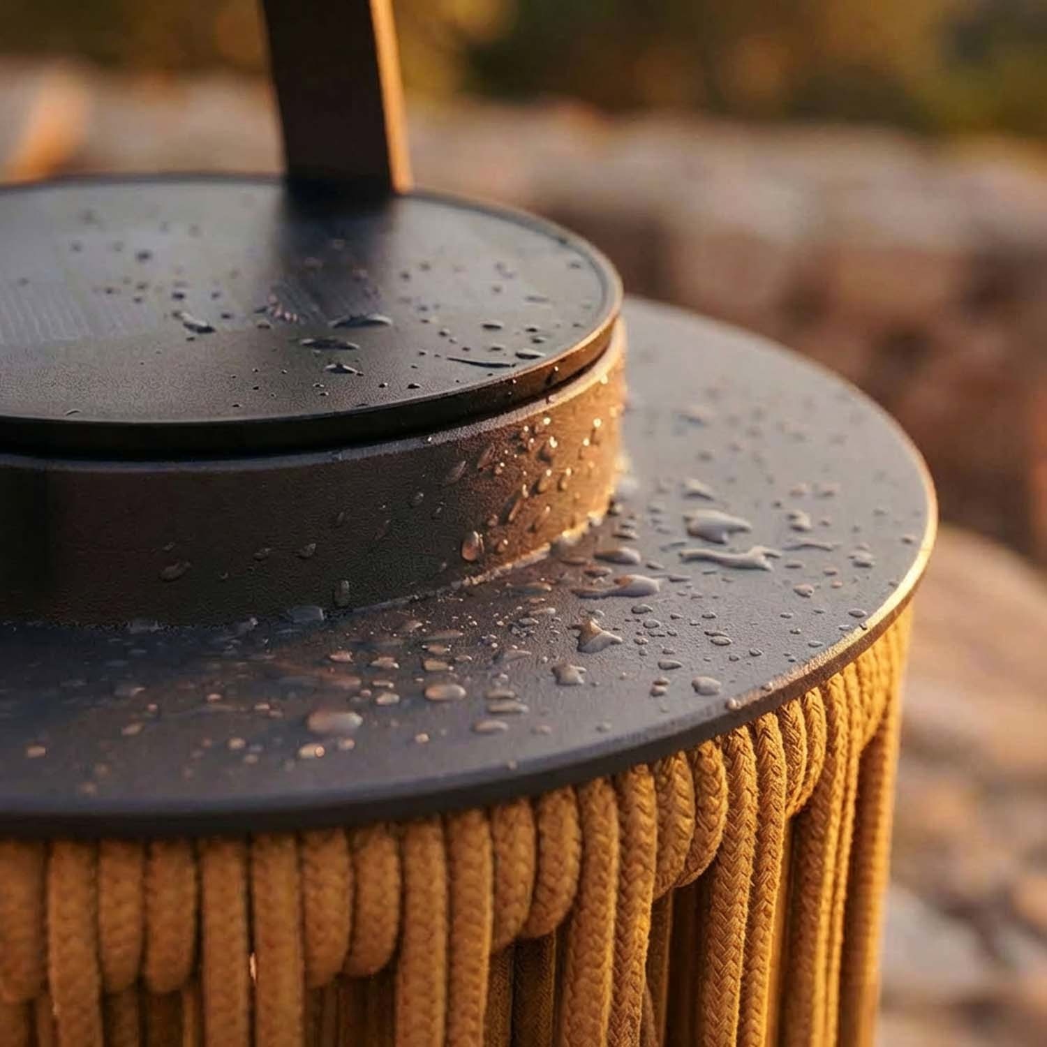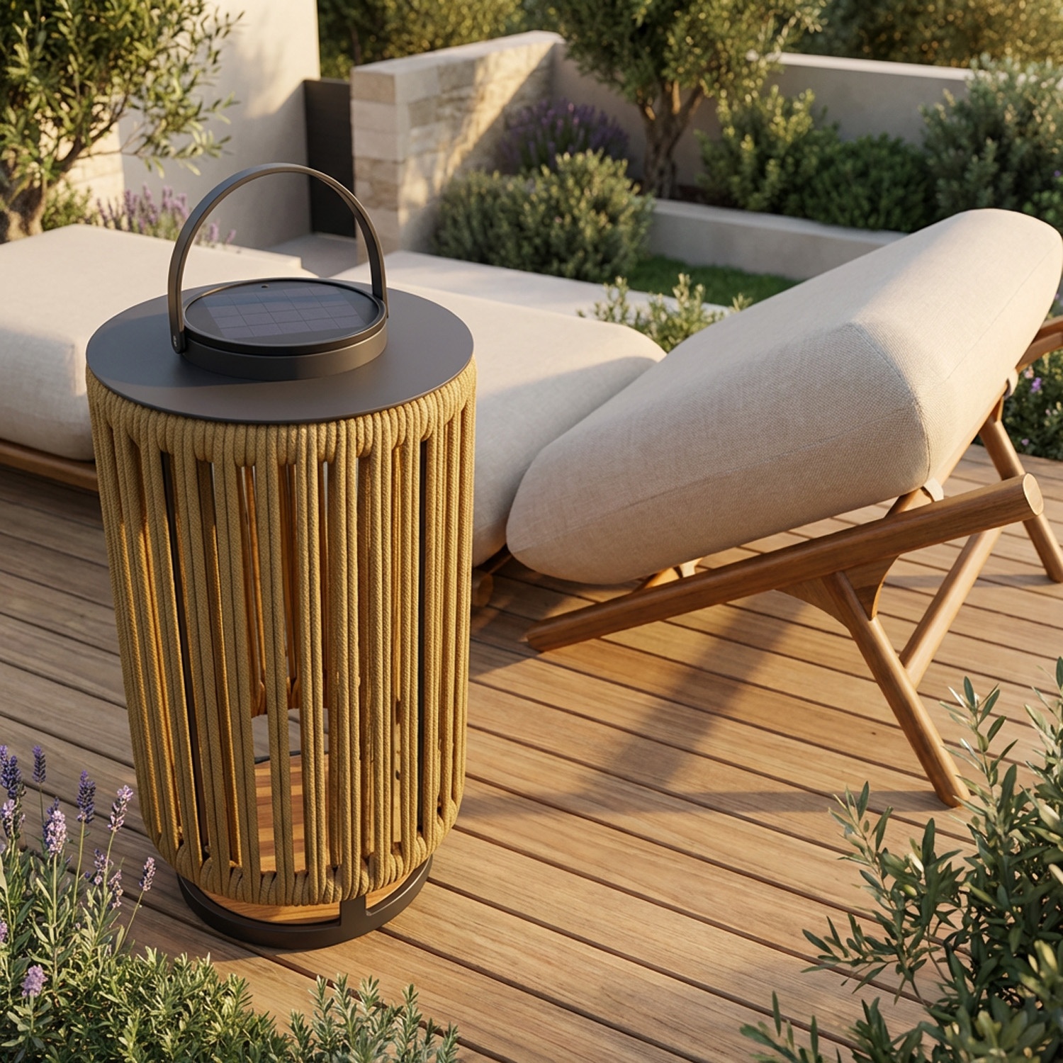 Marinea is a portable solar lamp with a radially braided nylon rope and a teak base.