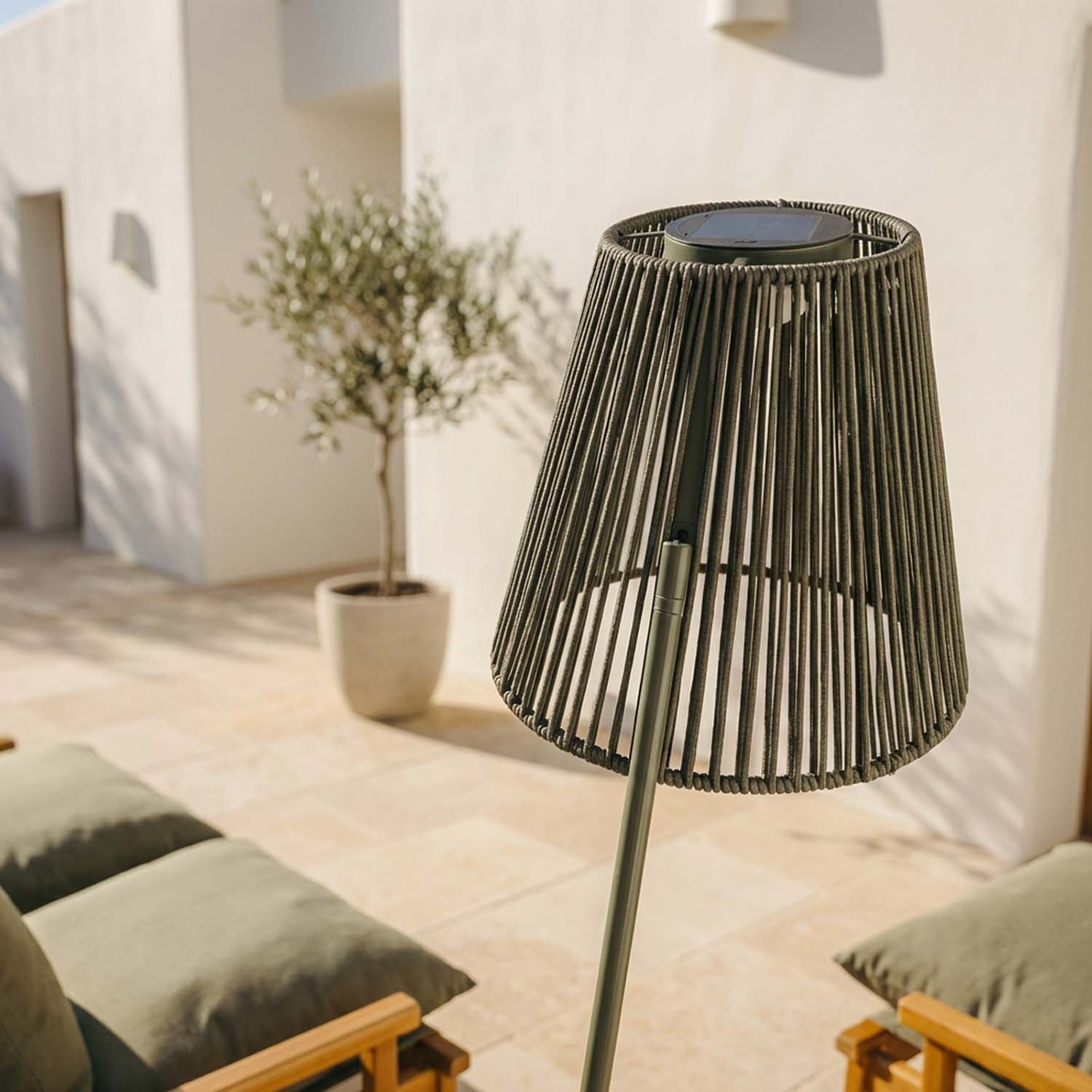 Ropelle is born from Maanta with a clear idea: to bring the atmosphere of a Mediterranean summer evening into your garden. The olefin polypropylene rope is not decoration — it is a screen that transforms light into a radial pattern of warm shadows. The solar panel makes it independent. The dusk sensor makes it smart. The iron coating makes it resistant to sun, rain and salt air. No cables to bury, no electrician to call: just light, where and when you need it.